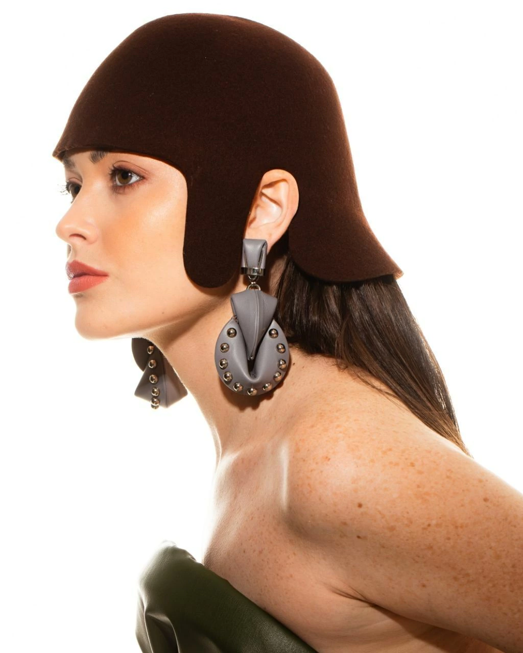 A parte superior do brinco traz em suas linhas a referência sutil da silhueta da face do cavalo Corcel, um brinco que reúne um design de excelência a expertise do trabalho manual em couro e eleva esta peça ao estado da Arte.