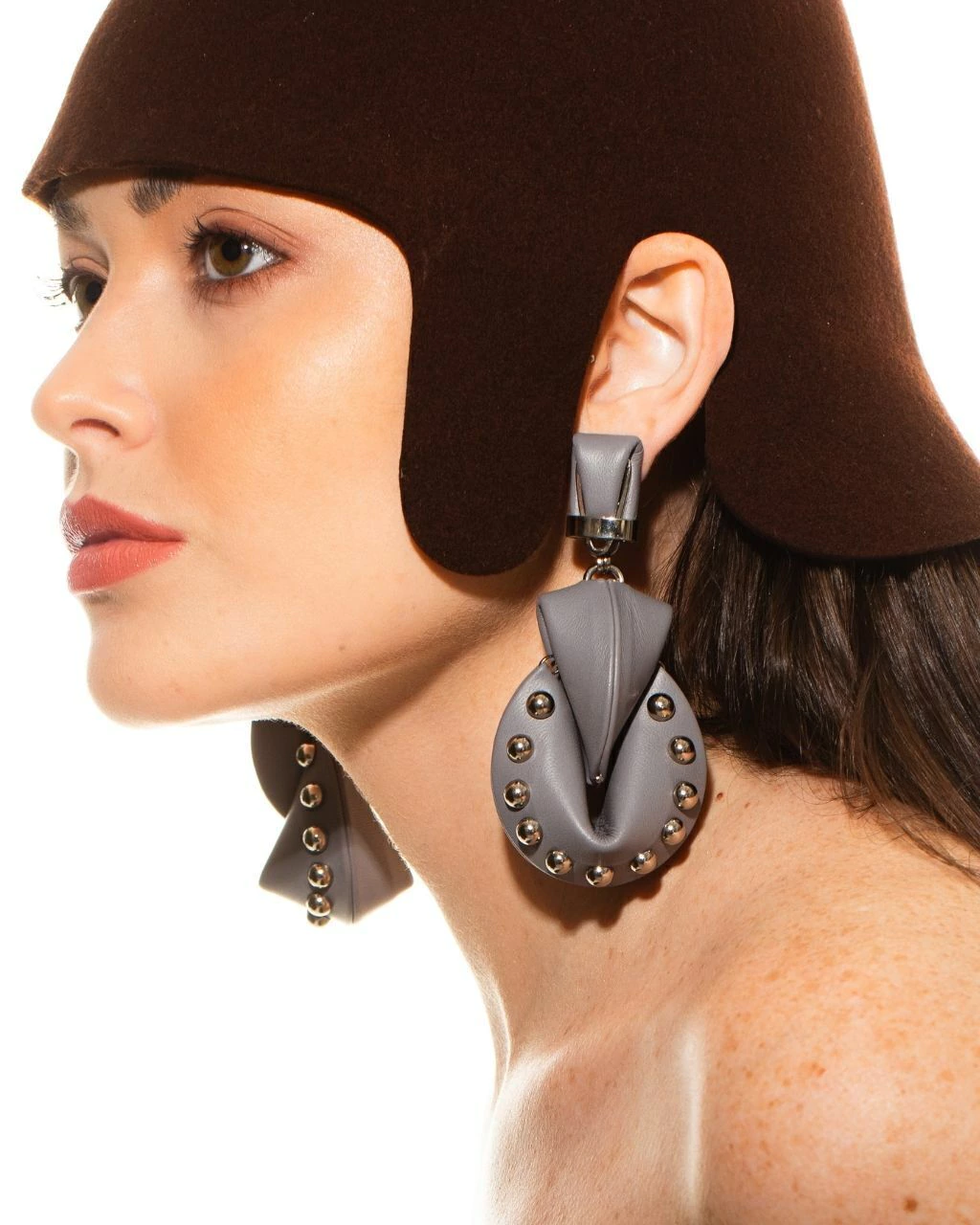 O Brinco Cravejo tem seu desenho inspirado na sola do casco do cavalo, onde as formas se transformam em volumes robustos que se entrelaçam de forma nada óbvia. A aplicação dos cravejos na parte inferior da peça realça a forma e a combinação de materiais entre couro e metal.